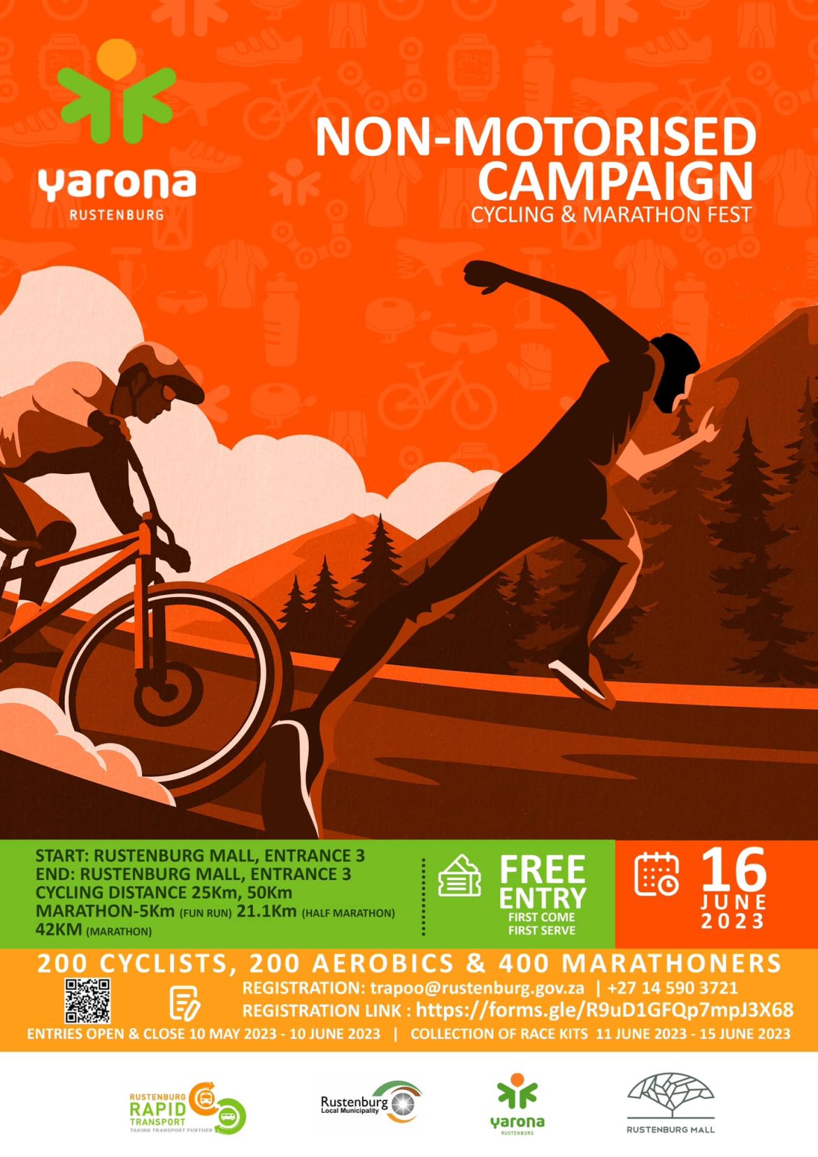 This year, first marathon gun for the Non-Motorised Campaign will be fired at 06:00 on June 16, 2023, at Rustenburg Mall, Parking at Gate 3. There will be events at the stadium for kids, adults, and everyone on the day, and the marathoners will take a separate route than the cyclists. In the end, every participant will end at the same destination, Gate 3, Rustenburg Mall.